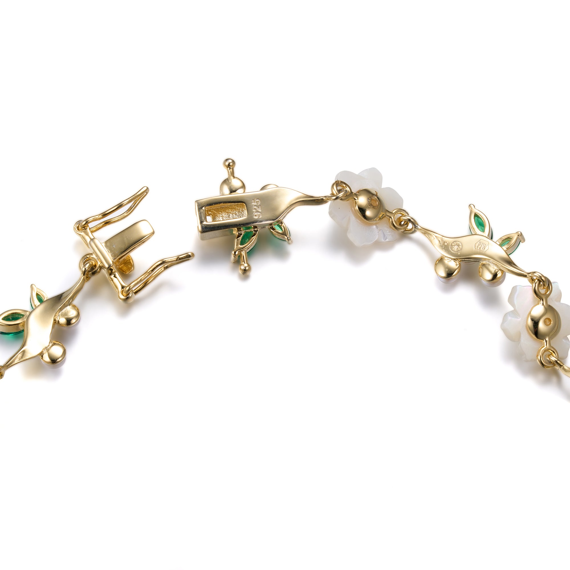 A silver gold plated bracelet with green stones, pearls and shell flowers.