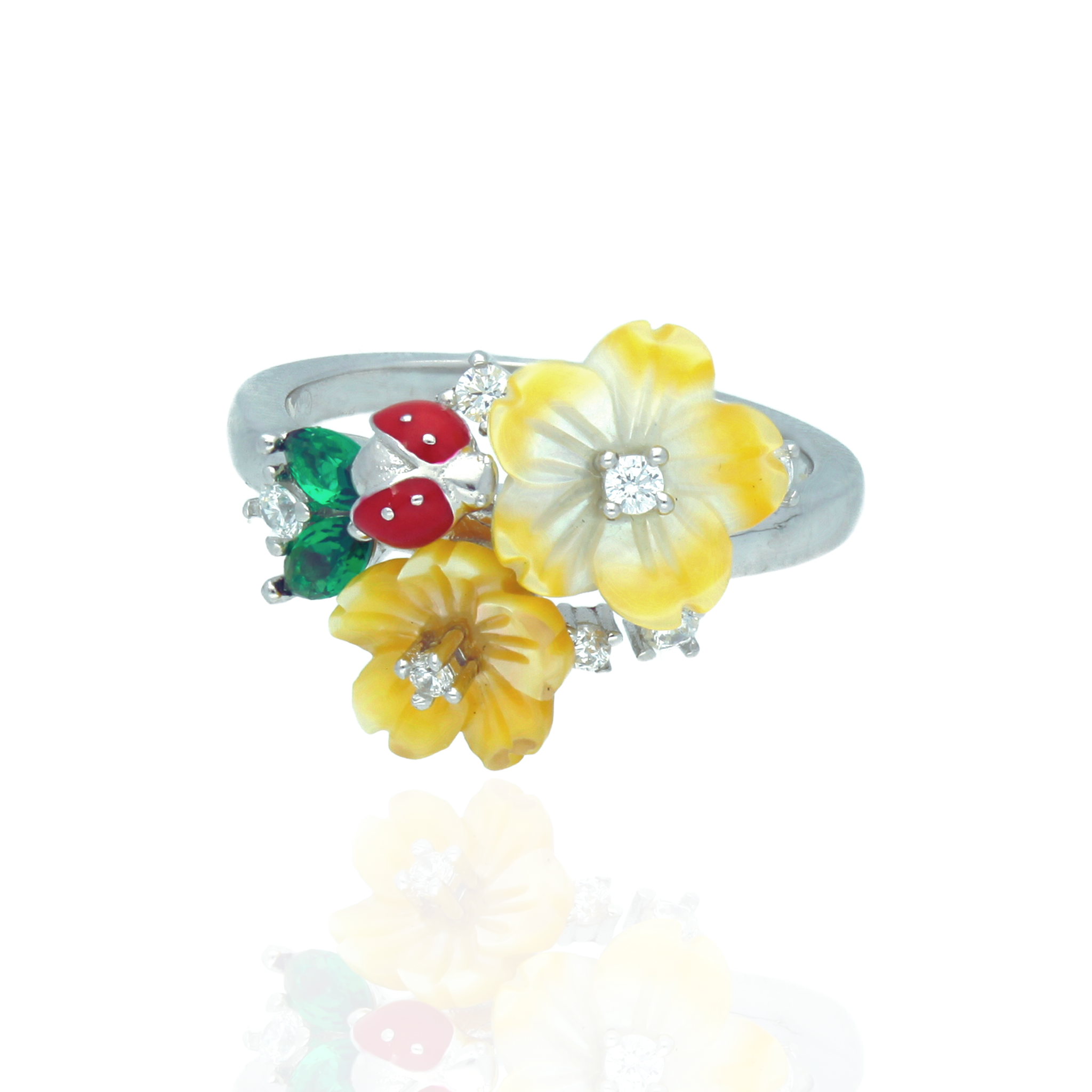 Explore our Amber Magnolia rings, crafted to evoke feelings of inspiration and vibrancy with their vibrant colors. Adorned with solar yellow shell flowers, emerald green zirconia, and a red ladybug, these rings are inspired by the enchanting scent of the magnolia flower. A delightful gift for a cheerful and vibrant woman!