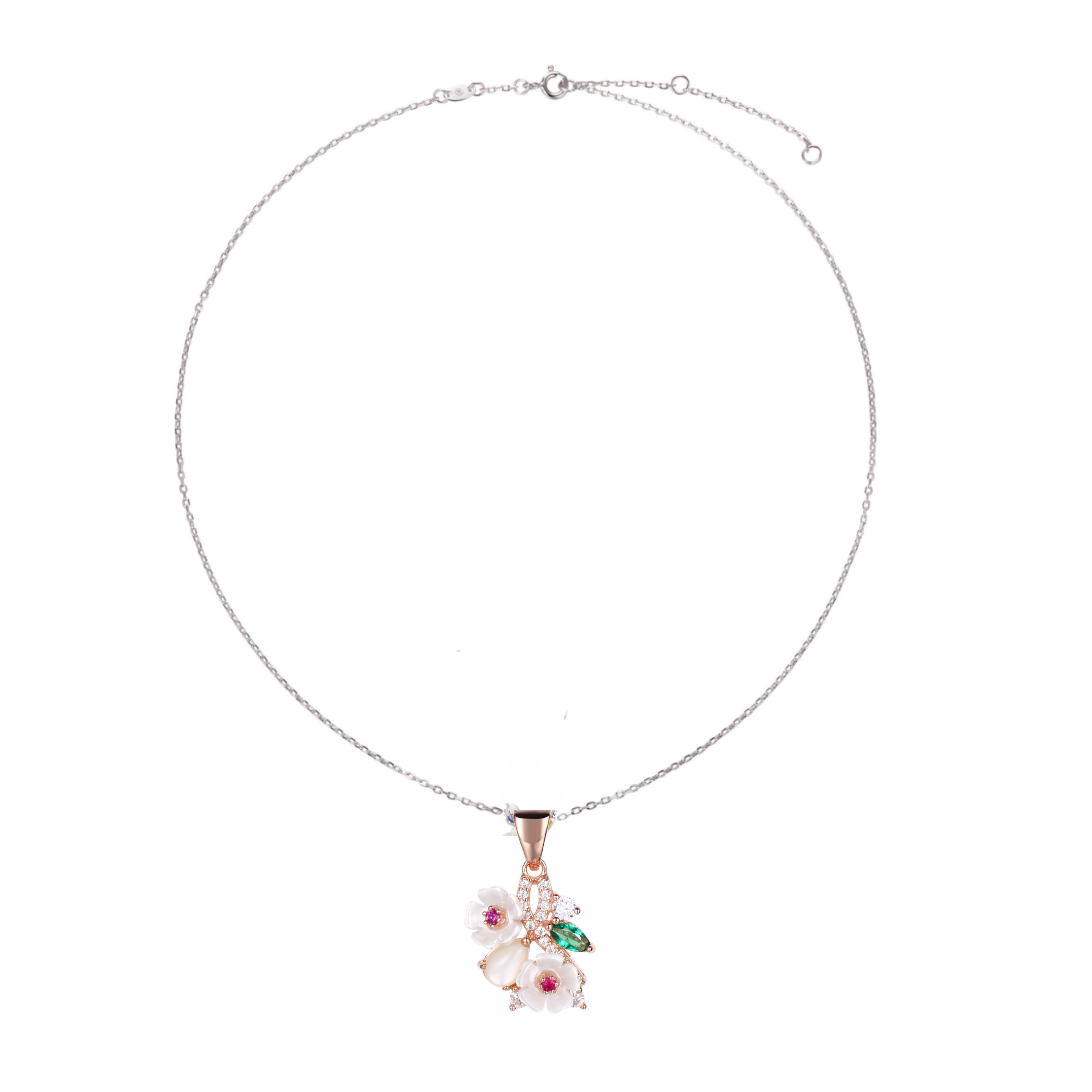 Angel Flowers Necklace from the Penelope Eden Collection—a meticulous selection of white mother of pearl flowers, green and white cubic zirconia, and a charming teardrop pearl detail. This angelic combination of whites with a hint of color adds a touch of elegance to any ensemble.