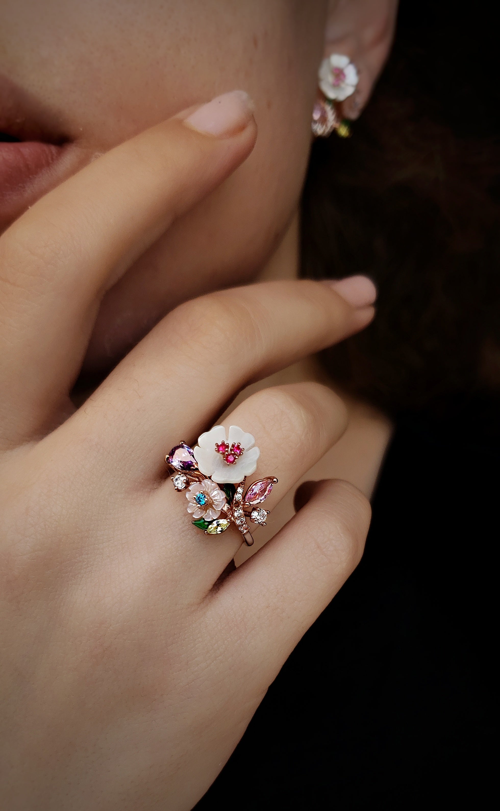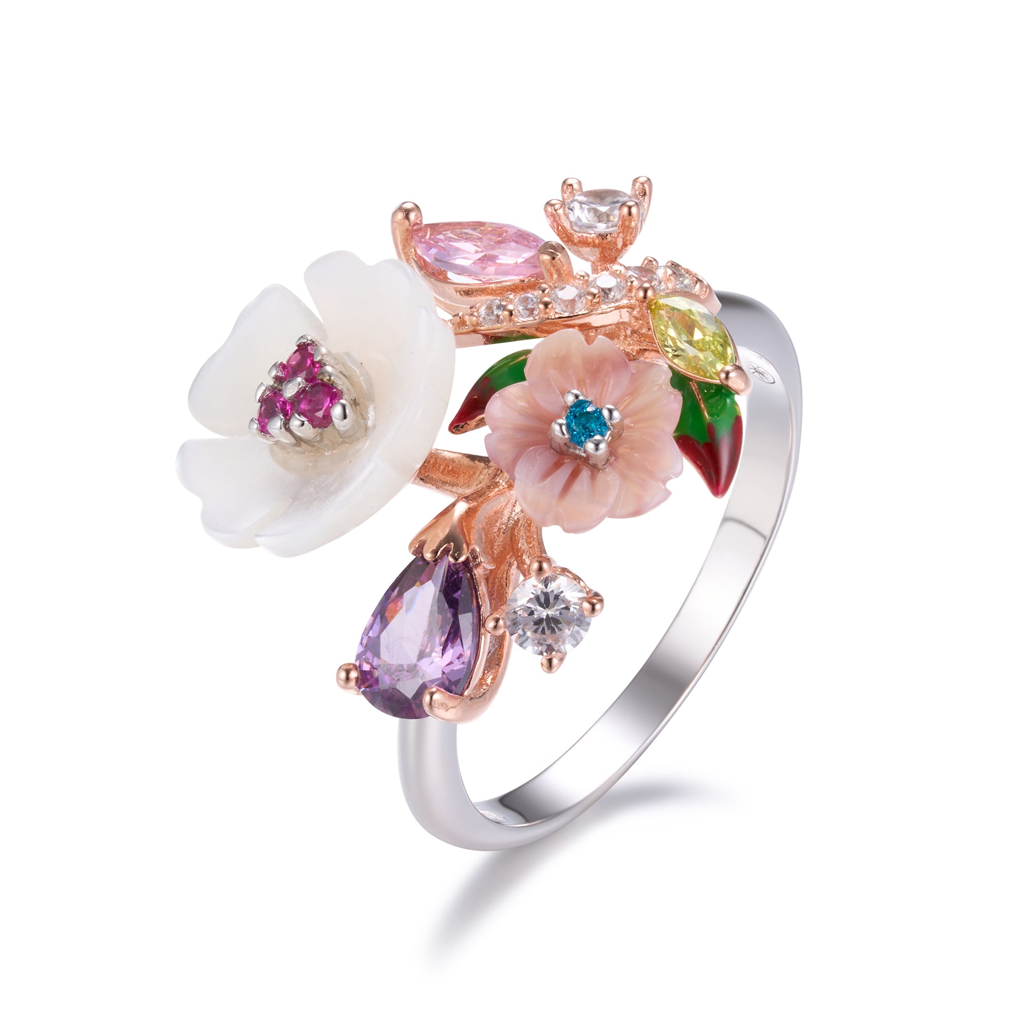 Bouquet Ring from Penelope Eden Collection captures the essence of nature with shell flowers, colorful zirconia stones, and enamel leaves. Meticulously crafted, these details form a vibrant bouquet. A unique addition to elevate your personal collection!