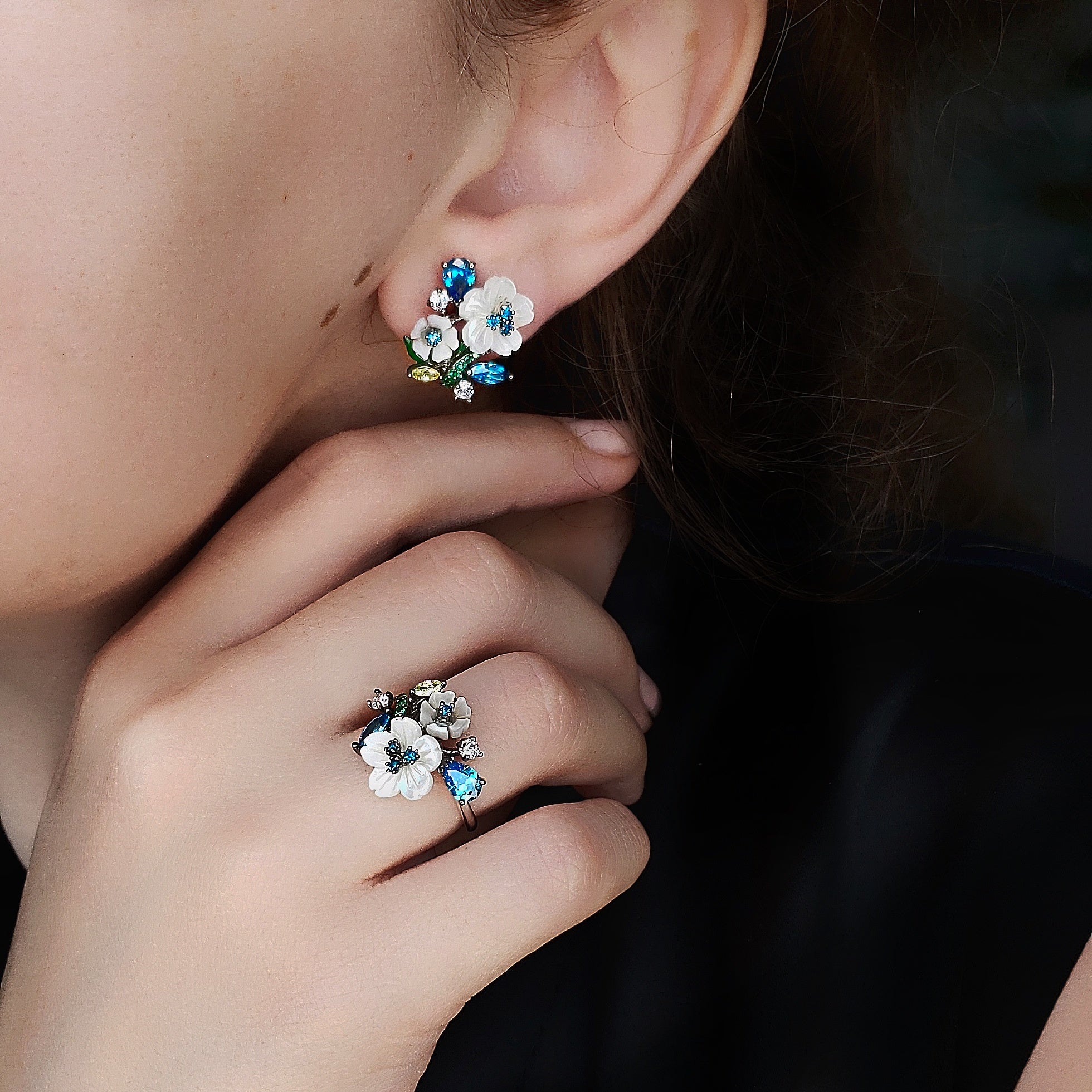Celeste Bouquet Earrings from Penelope Eden Collection beautifully depict nature with white shell flowers, colorful zirconia stones, and enamel leaves. Meticulously crafted, these elements come together to form a vibrant bouquet with cool tones of bleu celeste, white, and green. Elevate your personal collection with this unique piece!