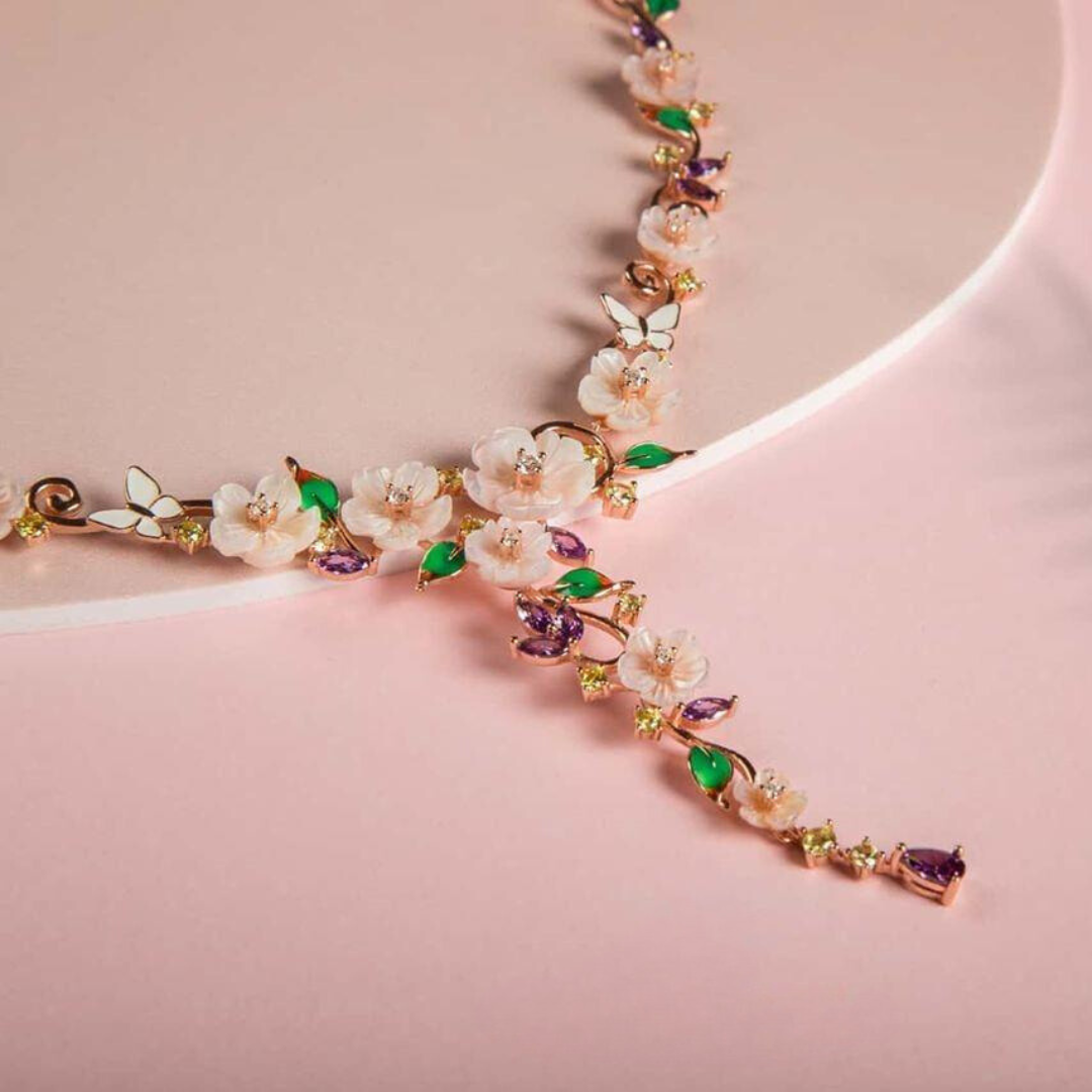 Cherry Blossom Necklace represents the sweet colors of nature and renewal of life. This magical piece with its details of pink shell flowers, enamel butterflies and violet zirconia stones is the perfect choice for an elegant and astonishing look!