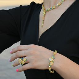 Embrace the warmth of autumn with our Fall Flowers Bracelet, adorned with vibrant yellow shell flowers, blue enamel butterflies, and green and red leaves, accented with white and aquamarine blue zirconia stones. Perfect for adding a touch of empowerment and romance to your look!