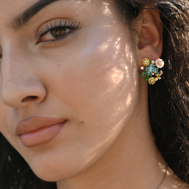 Embrace the beauty of nature's awakening with our Full Bloom creation from the Penelope Eden Collection. This vibrant piece features a colorful combination of sky-blue and white zirconia, blushed and gold shell flowers, and intricate enamel details. Each element meticulously crafted to represent the revitalizing essence of spring. Let the sky-blue zirconia symbolize flowing water, while the enamel green leaves and butterfly signify the rejuvenation of gardens. Add this unique piece to your collection and celebrate the essence of nature's bloom.