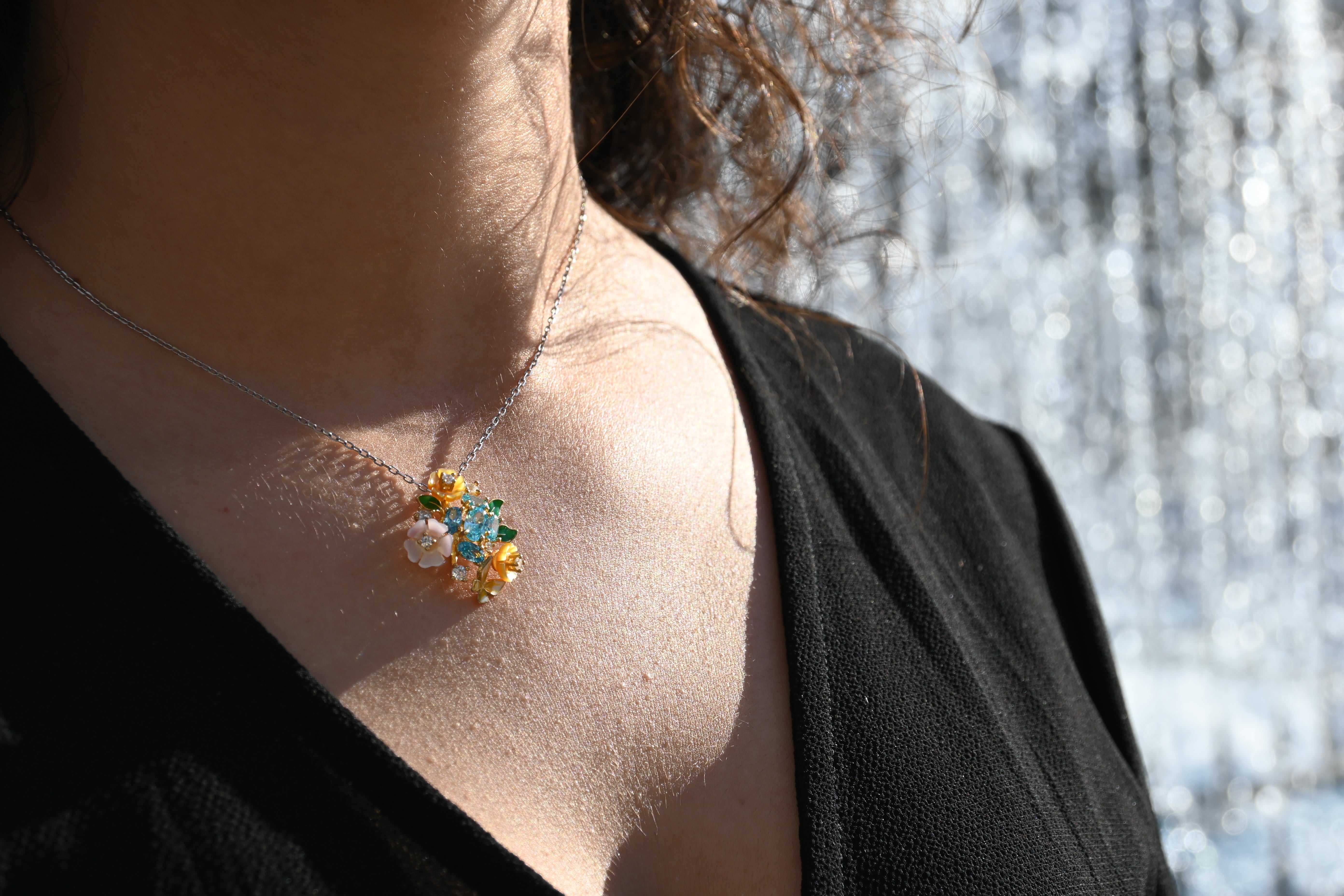 Experience the essence of spring with our Full Bloom Necklace from the Penelope Eden Collection. This captivating piece showcases a colorful array of sky-blue and white zirconia, complemented by blushed and gold shell flowers, and intricate enamel details. Each element is thoughtfully crafted to symbolize nature's awakening during the spring season. Let the sky-blue zirconia represent flowing water, while the enamel green leaves and butterfly signify the revitalization of gardens. Elevate your collection with this unique and vibrant necklace.