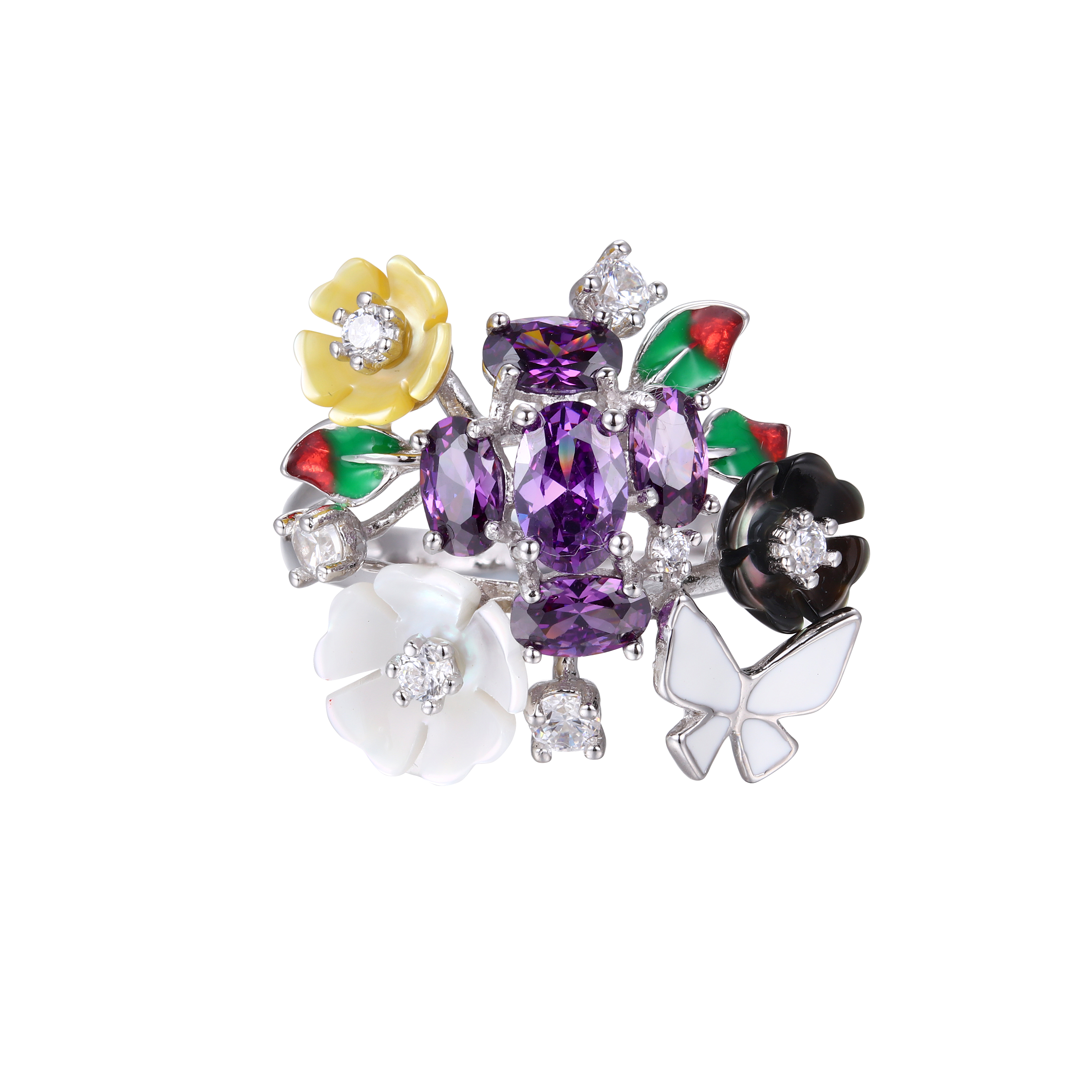 Mauve Full Bloom Ring from the Penelope Eden Collection boasts a vibrant blend of white and mauve zirconia, complemented by white, maroon, and gold shell flowers, and adorned with delicate enamel details. Meticulously crafted to capture the essence of nature's awakening in spring, this design features enamel green leaves and a white butterfly, symbolizing the rejuvenation of mountain landscapes.