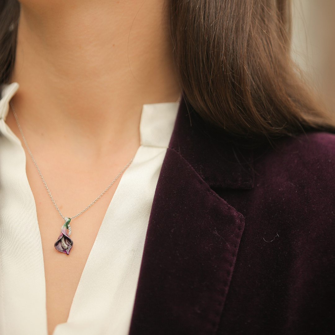 Royal Calla Lily is part of Art Nouveau Collection representing nobility and charm with its royal purple color and the mystery that every work of art holds in itself. The design of Royal Calla Lily mastered in handmade enamel painting will make you look stylish and elegant!