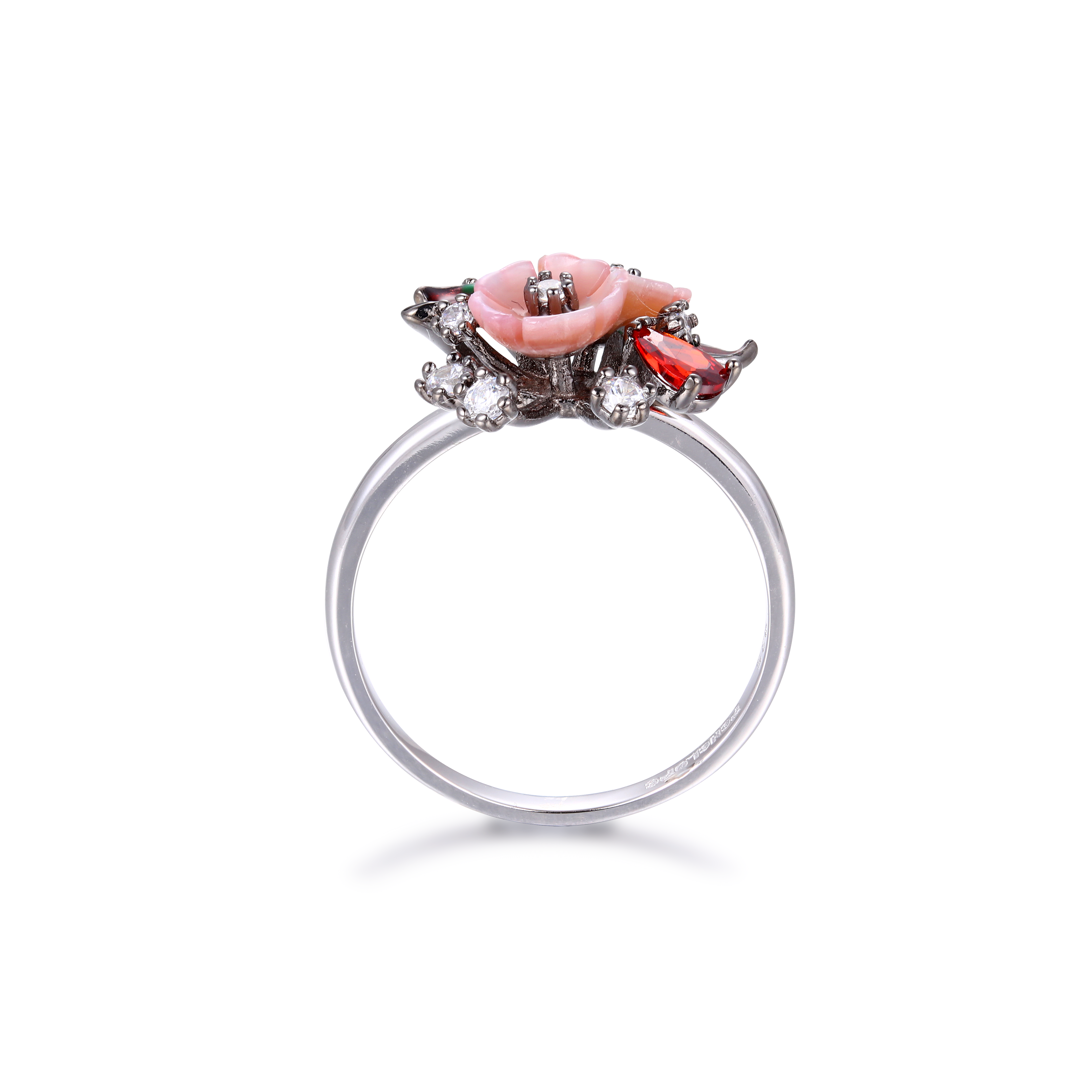 Introducing the Summer Wine Ring, a captivating piece with a unique color selection. Crafted with black and rhodium plating, this ring features blushed shell flowers, wine-red zirconia, and white cubic zirconia. Delicate enamel leaves in green and red accentuate its charm, adding a touch of mystery to your ensemble.