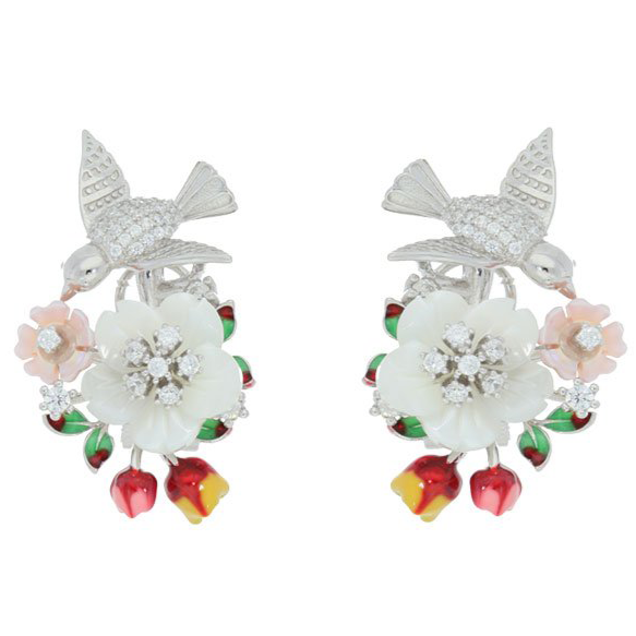 Experience elegance with the White Spring Earrings from the Penelope Eden Collection. Featuring white cubic zirconia and delicate shell flowers, they offer a romantic and sophisticated allure. The addition of a charming hummingbird charm and enamel details makes these earrings truly special, perfect for any woman looking to feel extraordinary.