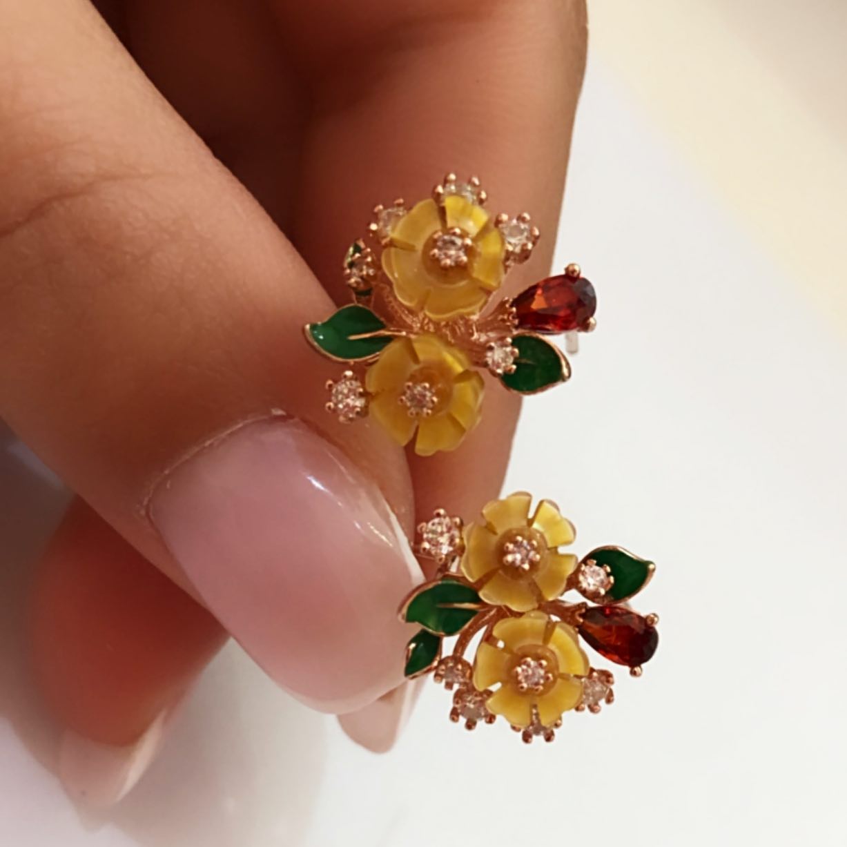 Introducing White Wine Earrings, a charming addition to your collection with a captivating color palette. Crafted with rhodium-plated silver, these earrings feature white wine-colored shell flowers, accentuated by red and white zirconia stones. Delicate green enamel leaves add a touch of sophistication. Elevate your style with this elegant and eye-catching piece, perfect for illuminating any outfit.